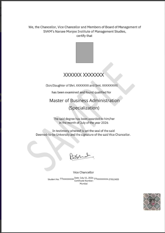 On successful completion of the online MBA program, learners receive a recognized and respected MBA degree from Narsee Monjee Institute of Management Studies (NMIMS). The certification is designed to add strong academic and professional value to a learner's career. MBA Degree Certificate from Narsee Monjee Institute of Management Studies. Degree is equivalent to the on-campus MBA. Mode of study (online) is NOT mentioned on the certificate. Holds full academic and professional recognition across India. Accepted by corporate employers, MNCs, and startups. Valid for government and private sector jobs. Eligible for higher education and professional growth. Suitable for learners pursuing an online MBA in Mumbai, online MBA in Pune, or any other city. Specialization mentioned on certificate: MBA in Finance, Online MBA in Marketing, Online MBA HR NMIMS, MBA Data Analytics Online, Online MBA in Operations Management. Each certificate clearly reflects the chosen specialization, highlighting the learner’s domain expertise. Enhances credibility and professional profile. Supports career advancement and leadership roles. Adds long-term value for those seeking the best online MBA degree.